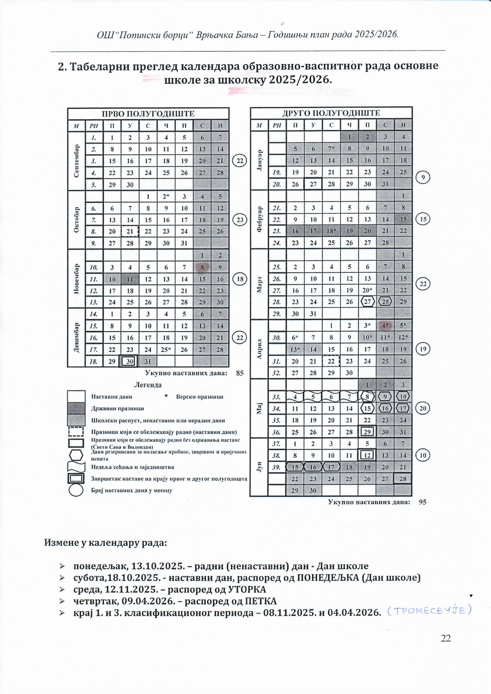 КАЛЕНДАР РАДА ОСНОВНИХ ШКОЛА ЗА ШКОЛСКУ 2025/26. ГОДИНУ